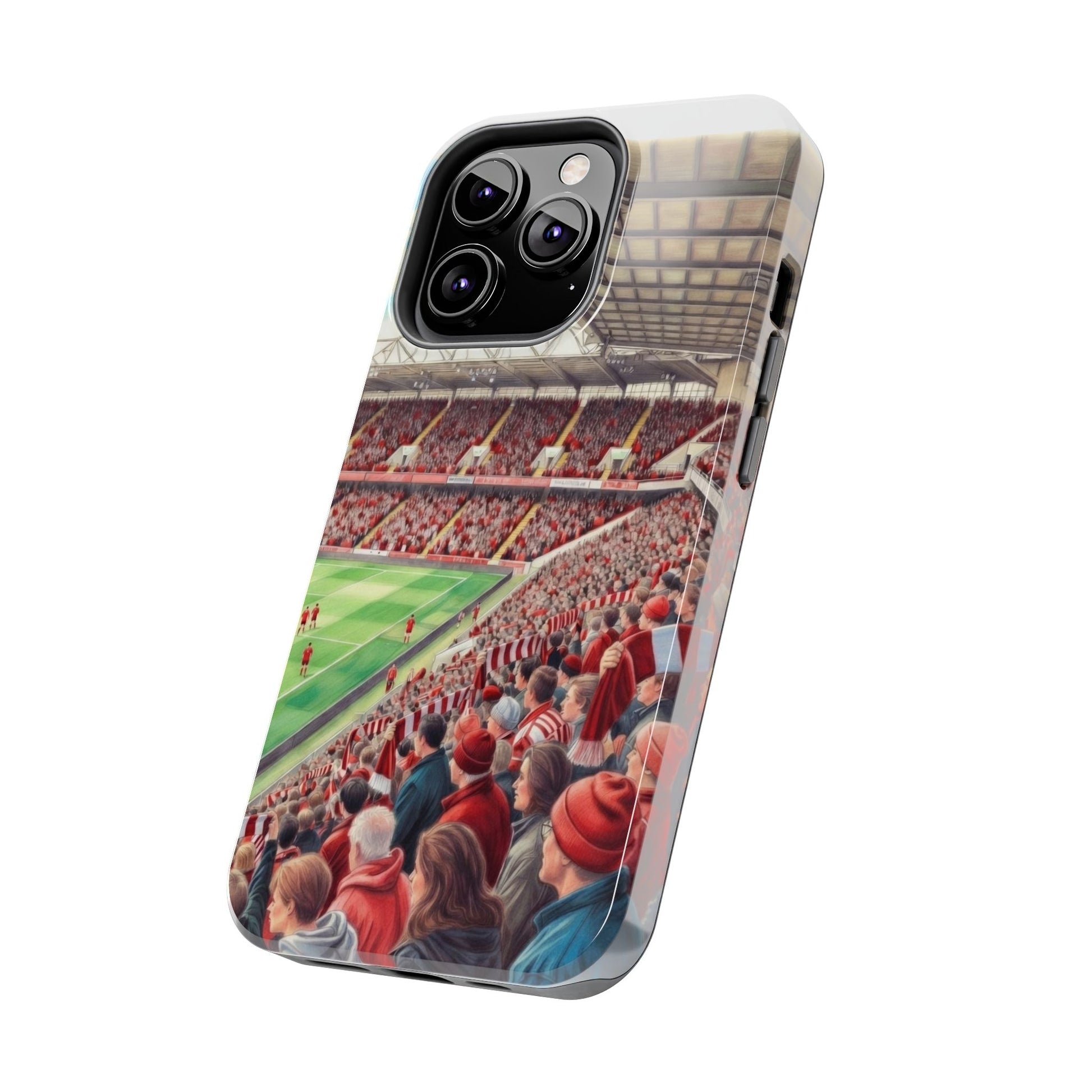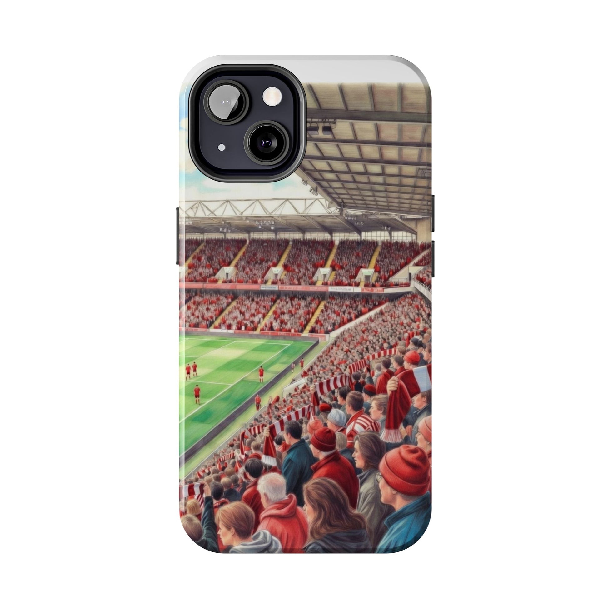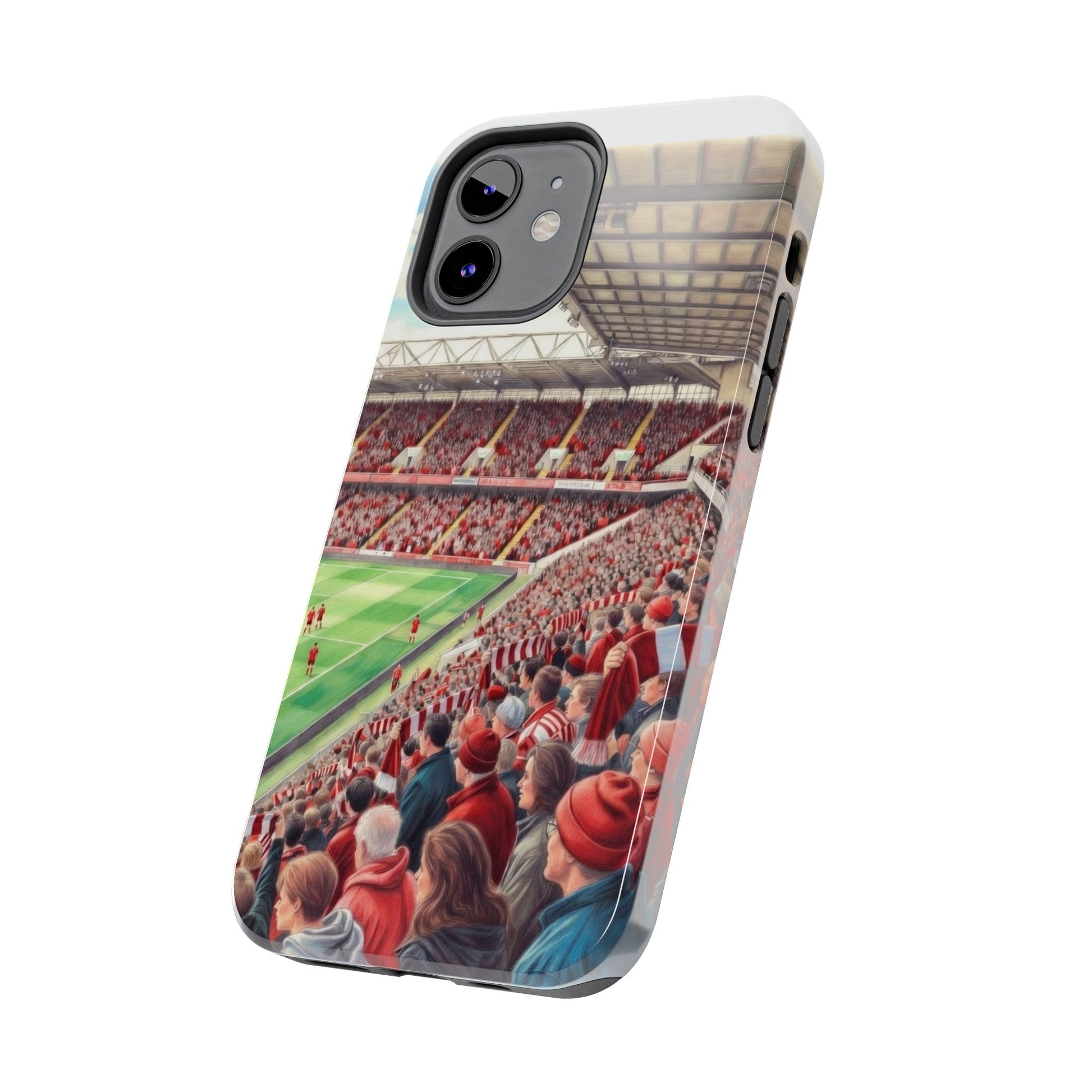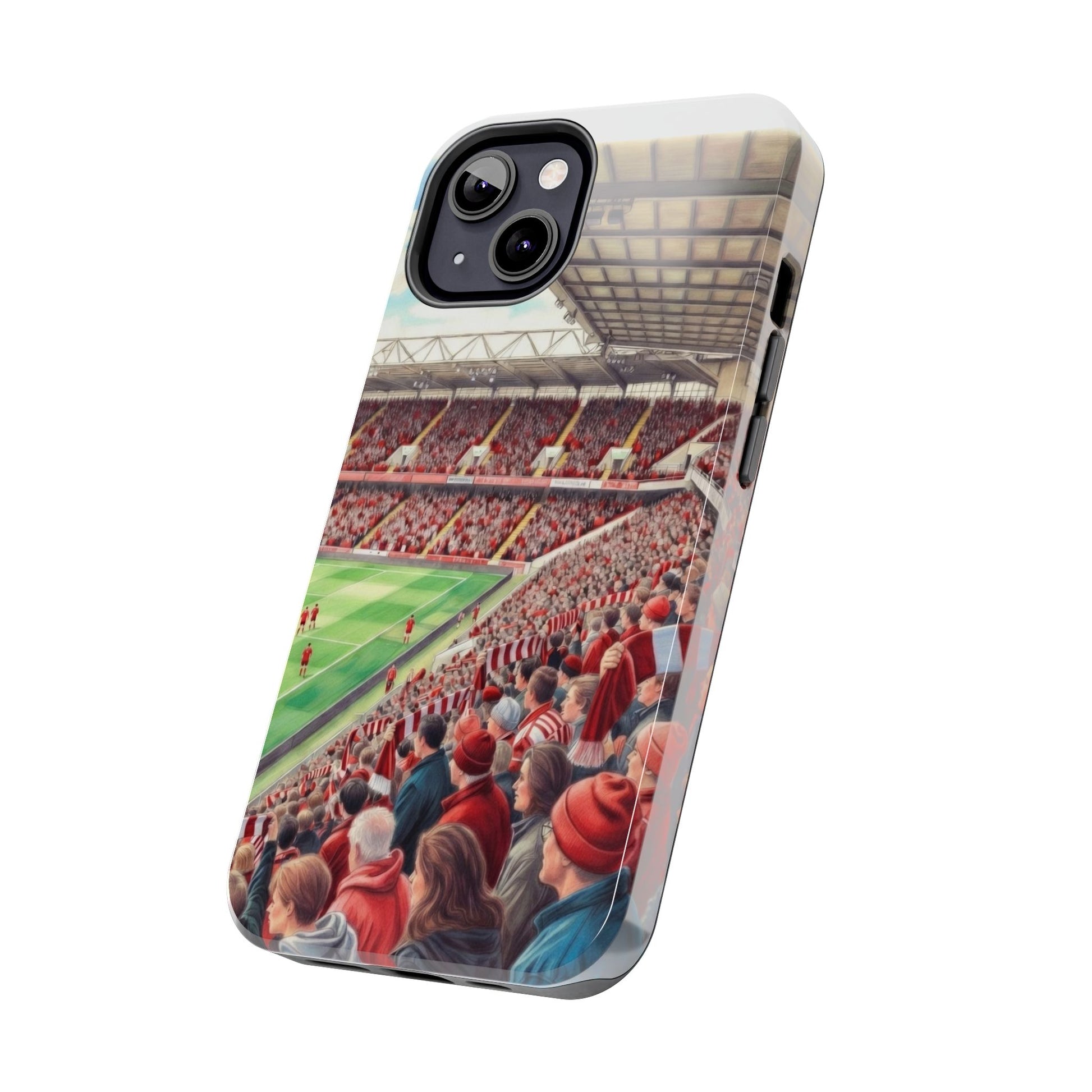 Feel the roar of the crowd every time you pick up your phone. This slim, glossy phone case wraps vivid stadium art around a tough polycarbonate shell and cushioned TPU liner — built to stand up to the rush of daily life while keeping your screen raised and safe. The print captures fans packed into the stands: scarves, beanies, and the electric green of the pitch. It’s a small, wearable reminder of match day energy — something to carry with you to commutes, travel, or the next trip to the ground.