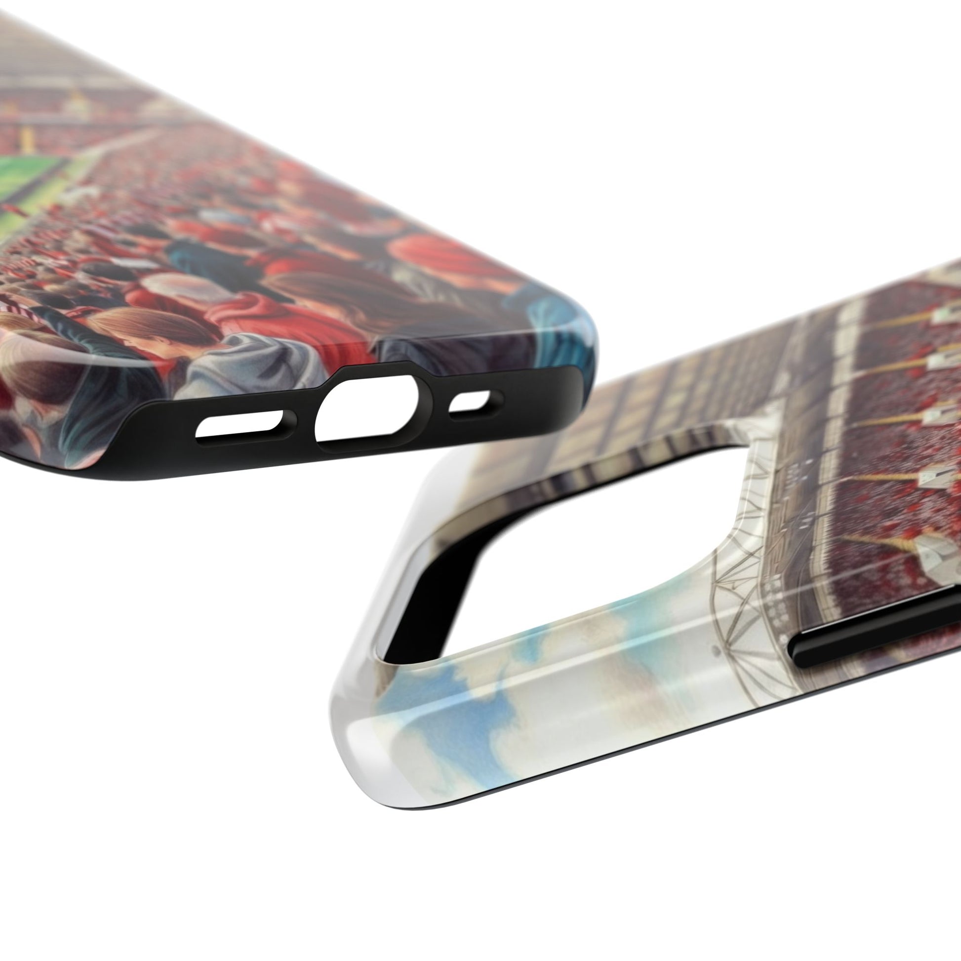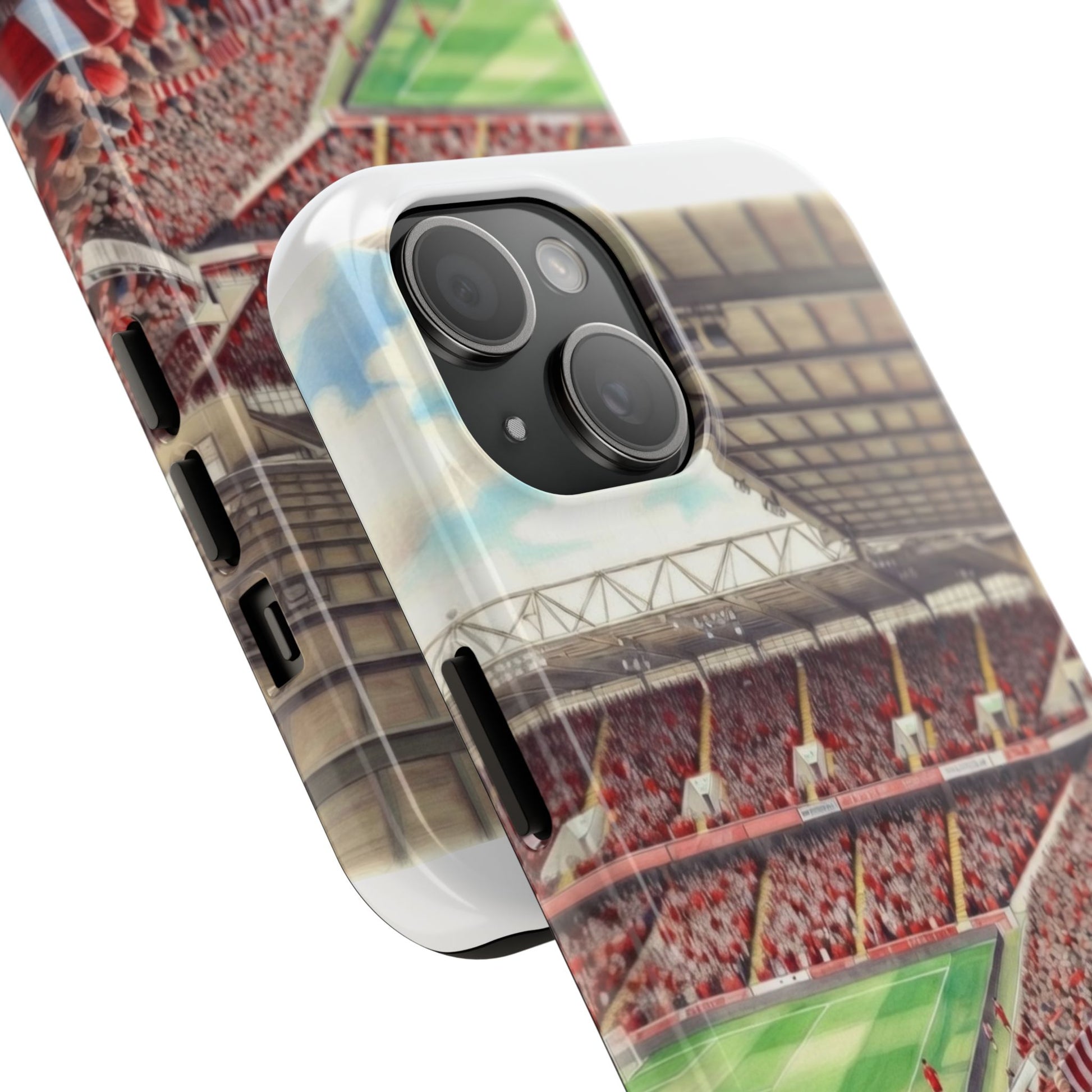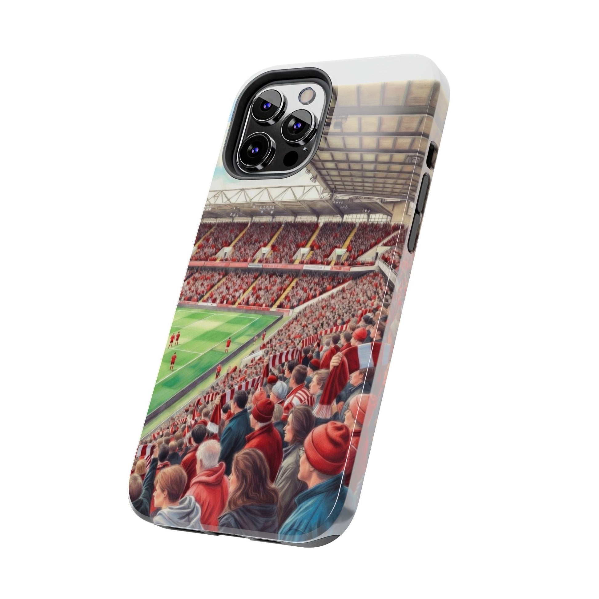 Feel the roar of the crowd every time you pick up your phone. This slim, glossy phone case wraps vivid stadium art around a tough polycarbonate shell and cushioned TPU liner — built to stand up to the rush of daily life while keeping your screen raised and safe. The print captures fans packed into the stands: scarves, beanies, and the electric green of the pitch. It’s a small, wearable reminder of match day energy — something to carry with you to commutes, travel, or the next trip to the ground.
