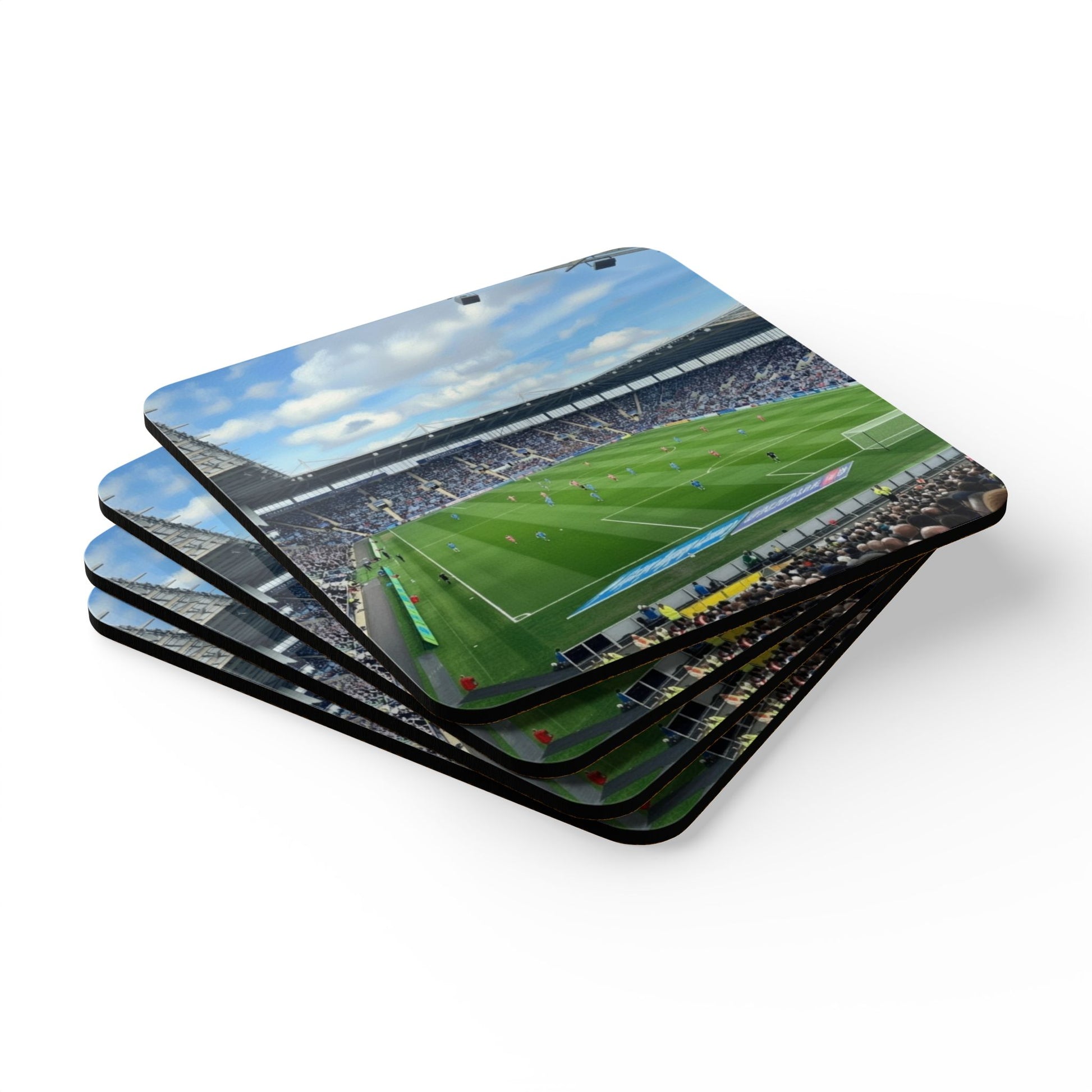 Bring the roar of the stadium to your coffee table with this four-piece cork-backed coaster set. Each 3.75" square shows vivid, full-colour artwork under a glossy MDF top that catches light and detail. The slim 0.16" profile keeps surfaces neat while the cork underside grips tables and protects finishes from moisture and heat. These coasters slide into a game-day routine: laid out for cold drinks, swapped under a mug during halftime, or stacked ready for the next match. They pair the durability of modern print techniques with everyday practicality, so your tabletop stays protected and your favourite moments stay bright.